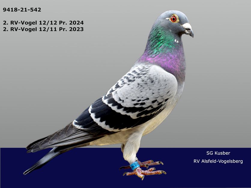 09418-21-542 flog von 12 Einsätzen 12 Preise mit 3.899 Pr.Km und 585.92 AS-Punkten (darunter den 5. Konkurs). Er wurde auch 2. RV bestes Männchen. In 2023 flog er von 12 Einsätzen 11 Preise mit 3.832  Pr. Km mit 493,20 AS-Punkten und wurde 2. RV bestes Männchen (darunter den 12. Konkurs). Als Jähriger er von 11 Einsätzen 7 Preise (darunter den 19. Konkurs) und als Jungtier von 3 Einsätzen 2 Preise (darunter den 5. Konkurs). Sein Vater ist der im Bericht bereits mehrfach erwähnte 09418-16-441. Er ist aus dem Stammpaar 08978-08-201 von Peter Trost mit der Täubin 02884-15-616 von H. u. F.Sander. Seine Mutter ist die 09418-11-414 W. Sie stammt aus dem Sein im Bericht benannten AS-Vogel 09418-97-794. Dieser geht zurück von Karl Hesse und Dr. Linsen. Großvater des 794 war der 09418-92-651 1. AS Vogel im 25. Bezirk. Mutter der 414 ist eine Täubin von Albert Marcelis aux der Linie des Sprint.